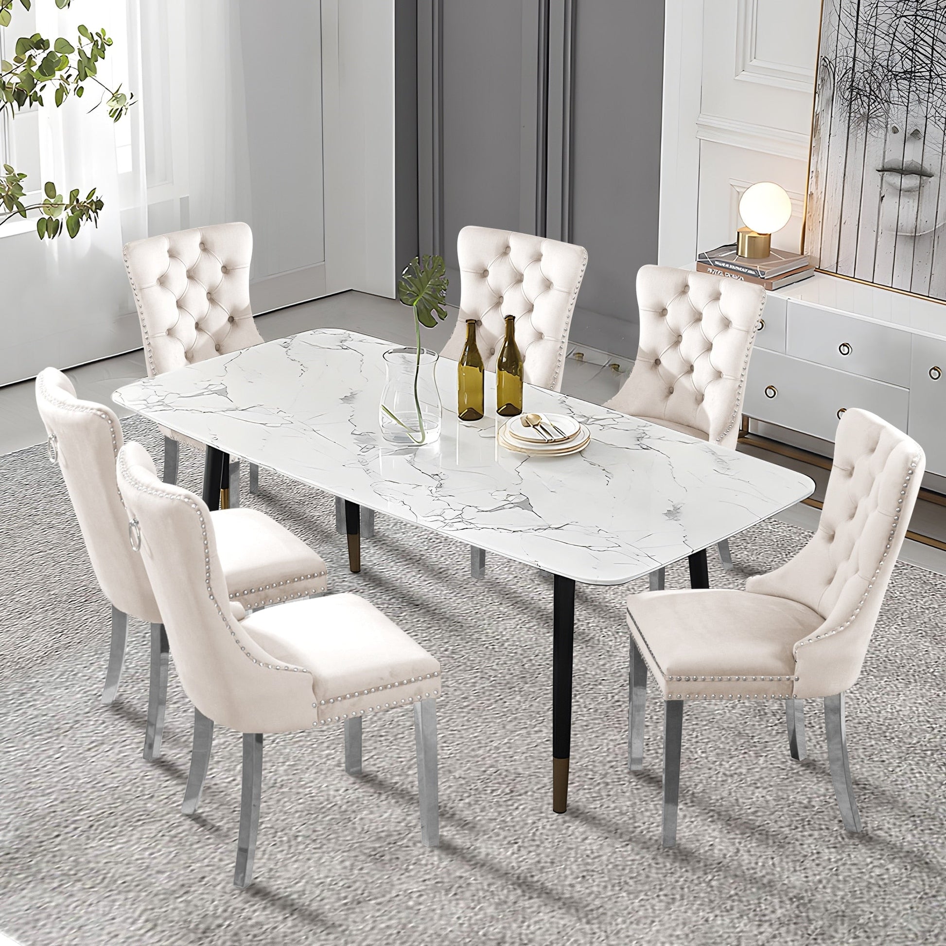 Ces chaises de salle à manger à oreilles sont fabriquées en velours de haute qualité, très résistant à l'usure et à la décoloration. Épais et luxueux, ce tissu offre un toucher délicat. Cet ensemble de chaises en velours arbore un style Mid-Century très moderne. Son dossier haut offre un soutien confortable et solide. De nombreux rivets décoratifs ornent le coussin et le dossier, lui conférant noblesse et élégance, tout en lui conférant une sensation de luxe raffiné. Nous fournissons des instructions et des vidéos de montage. Pour toute question, n'hésitez pas à nous contacter.