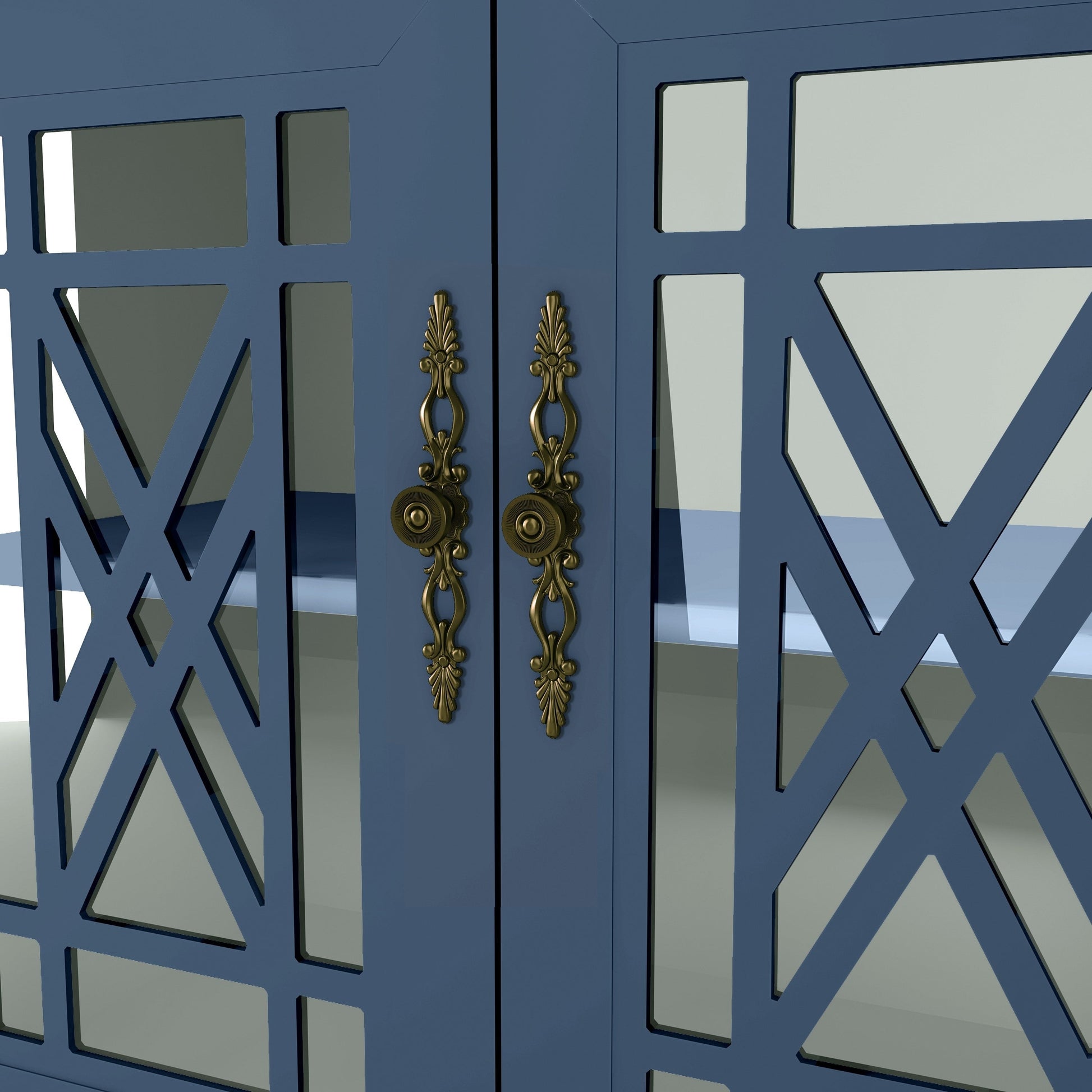 • Quatre portes à panneaux de verre avec une superposition de bois complexe et des poignées en métal de style vintage