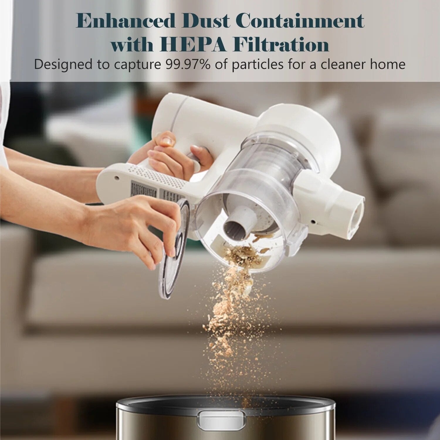 [Filtration HEPA] : Doté d'un système cyclonique scellé avec filtre HEPA, il retient les poussières fines et les allergènes, prévenant ainsi la pollution de l'air. Le vidage du bac à poussière par simple pression assure une élimination rapide.