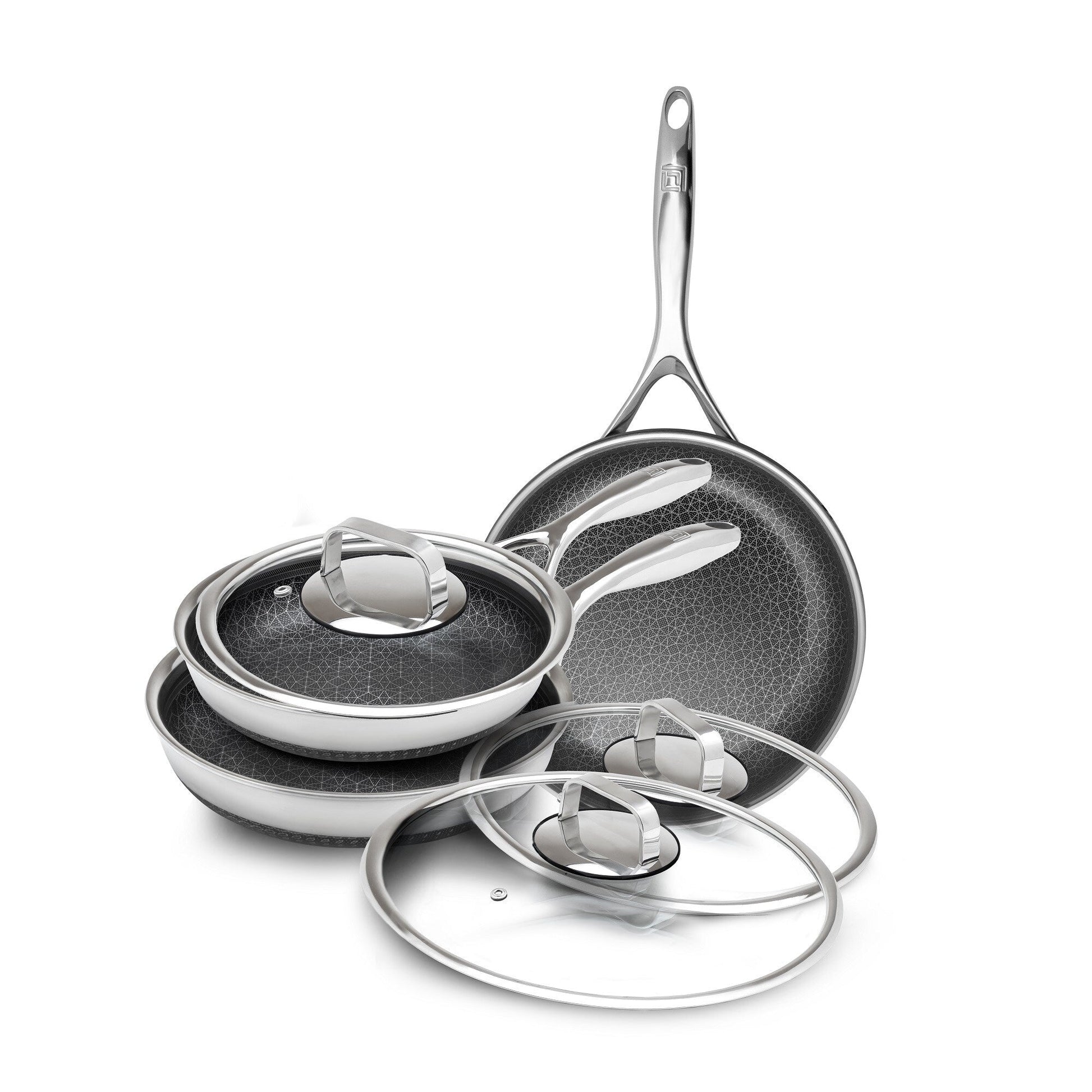 • Ensemble de 6 pièces : comprend des poêles à frire hybrides de 8', 10' et 12' avec couvercles en verre trempé assortis.