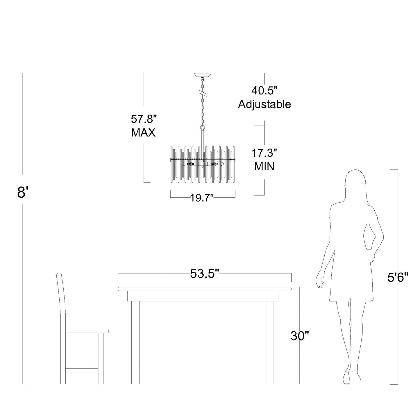 • Hauteur de suspension maximale (du plafond au bas du luminaire) : 57,8 pouces, qui peut être raccourcie.