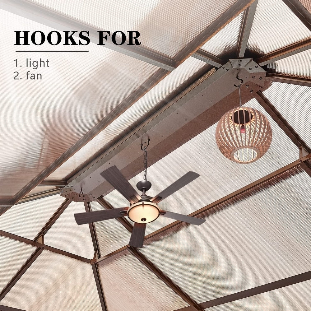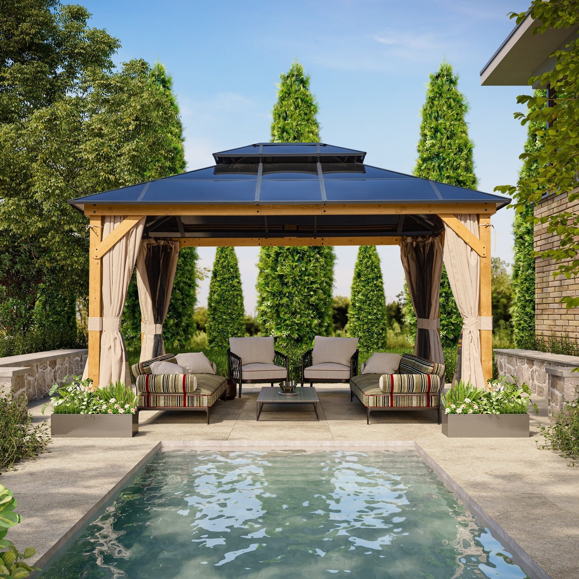 Gazebo à toit rigide EROMMY, pergola d'extérieur avec double toit, filet et rideaux, auvent robuste pour patio, arrière-cour, fête au bord de la piscine