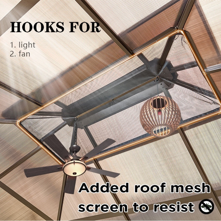 Ce gazebo est doté d'un double toit sophistiqué avec des espaces de ventilation surélevés, améliorant la circulation de l'air pour une expérience plus fraîche. Le système de ventilation intelligent, combiné à des bouches d'aération latérales dissimulées , aspire l'air frais en continu tout en accélérant la remontée de l'air chaud, vous gardant au frais même pendant les fortes chaleurs estivales. Profitez de l'équilibre parfait entre ombre totale et confort d'une brise naturelle, que vous receviez des invités ou que vous vous détendiez seul, comme sous la canopée d'un arbre.