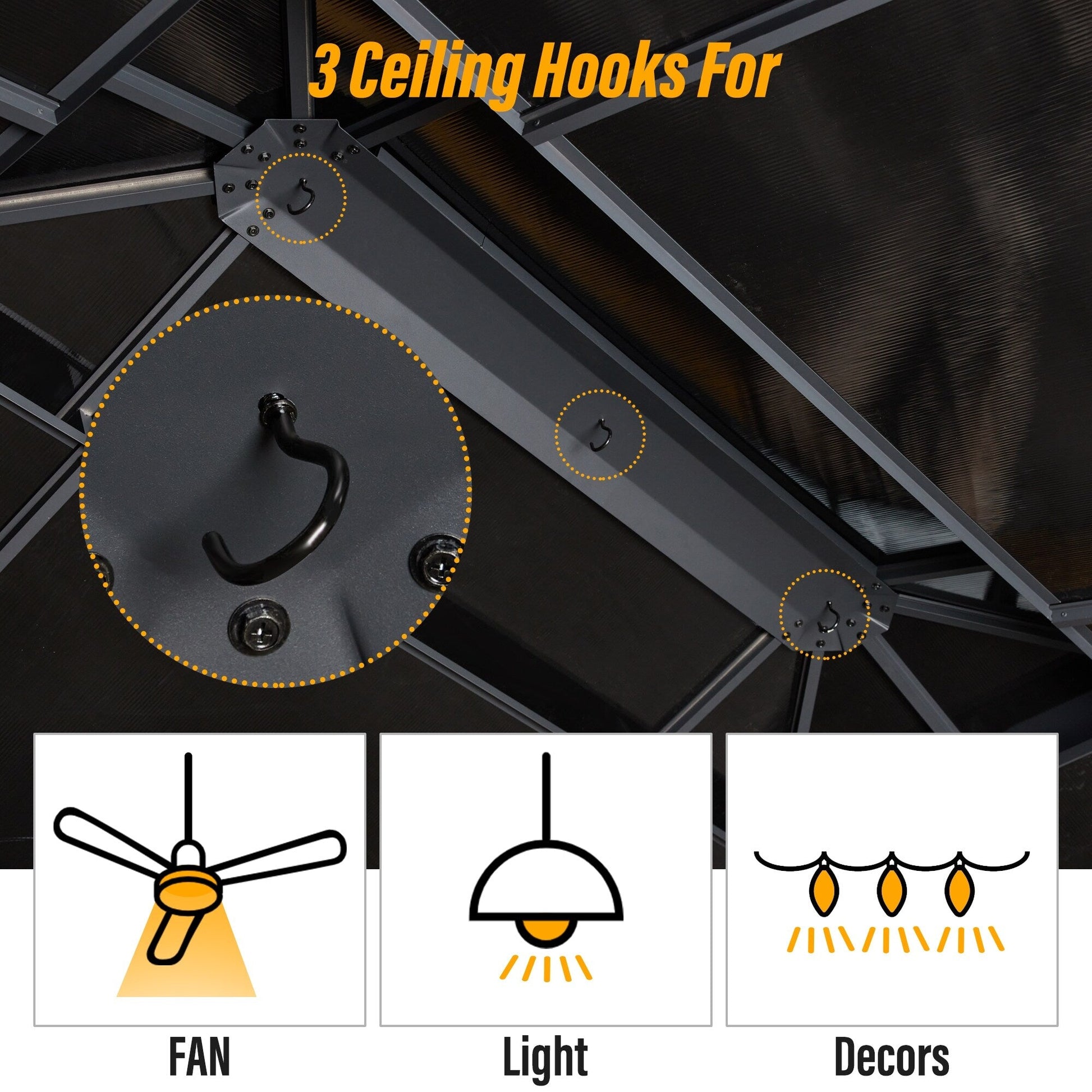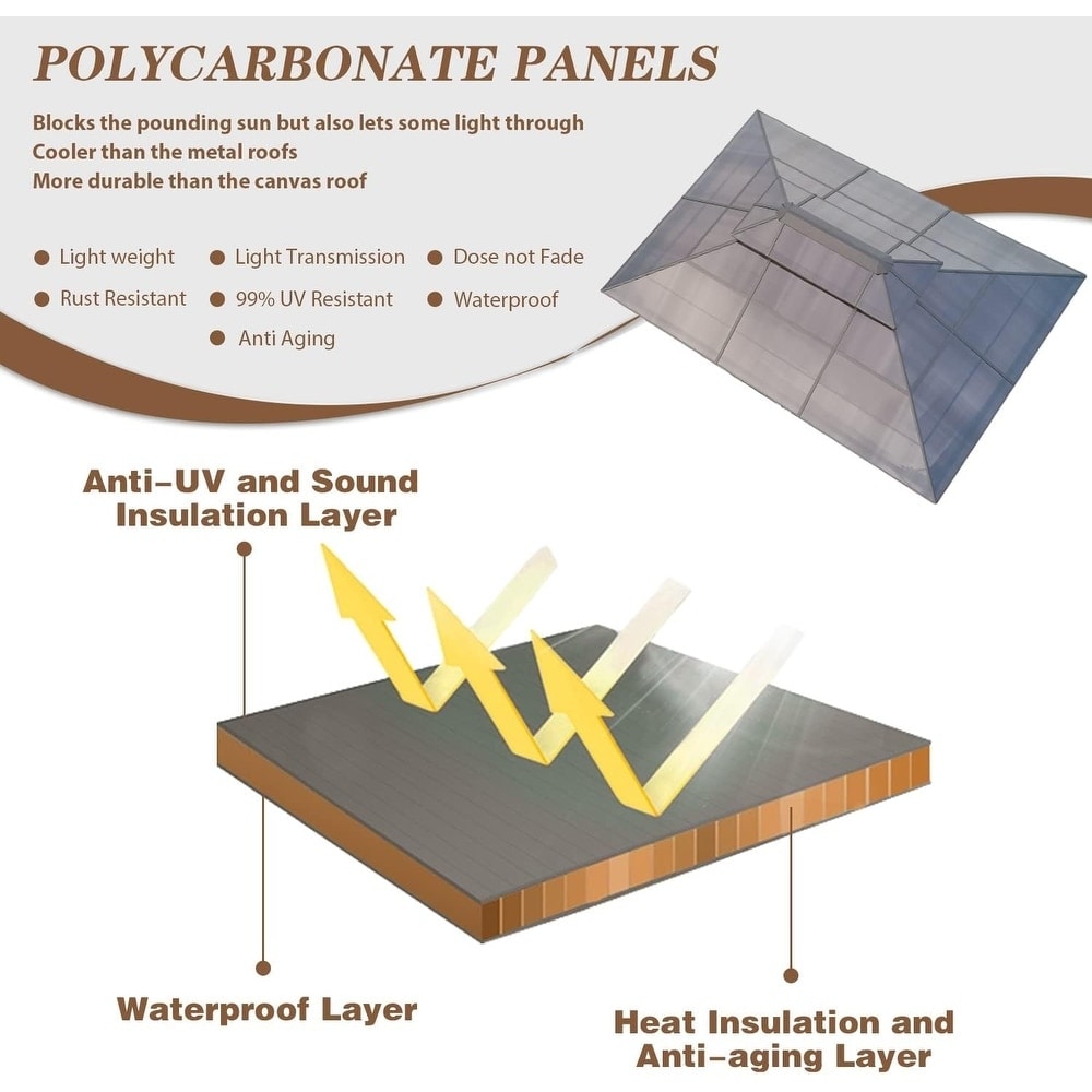 Ce gazebo haut de gamme s'adapte à tous les scénarios : barbecues en terrasse, pique-niques, thés en terrasse, barbecues dans la cour, rassemblements dans le jardin ou détente au bord de la piscine. Son design élégant offre une protection idéale contre l'ombre, tandis que sa structure ouverte accueille parfaitement un barbecue et un ensemble table et chaises pour 7 à 9 personnes , optimisant ainsi votre expérience en plein air, du café du matin aux repas du soir, avec un confort et une praticité optimaux.