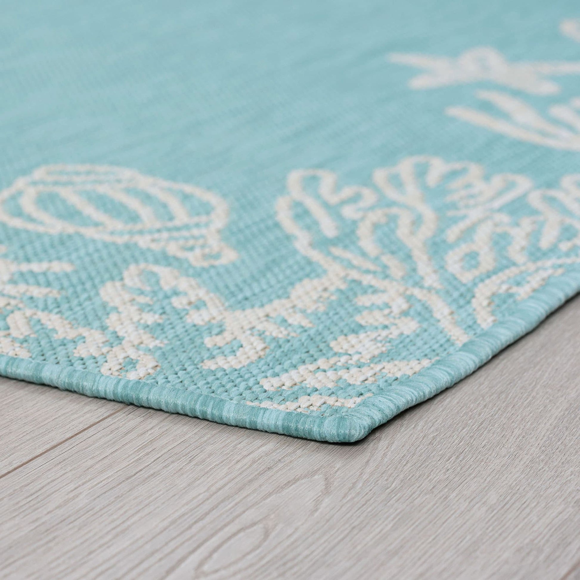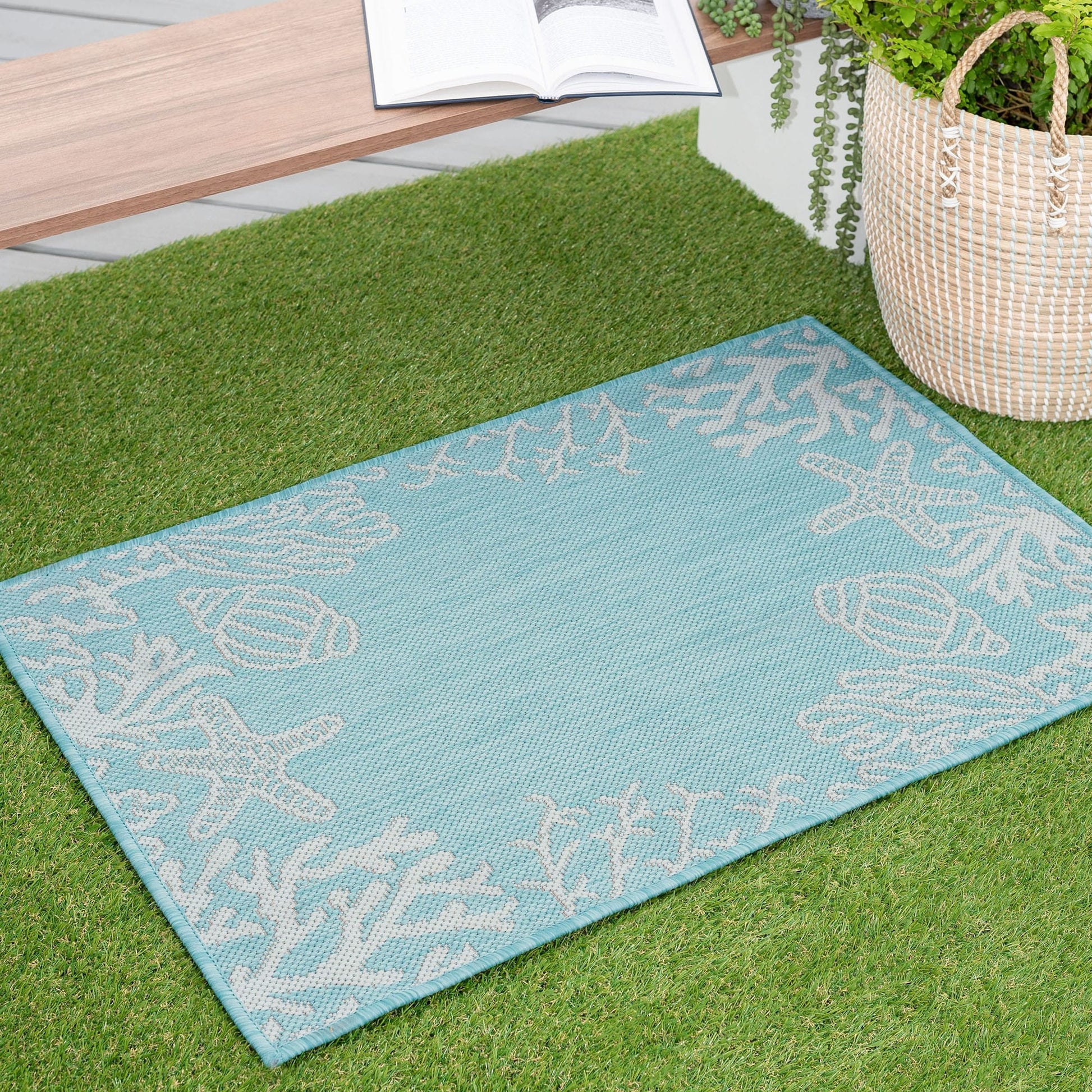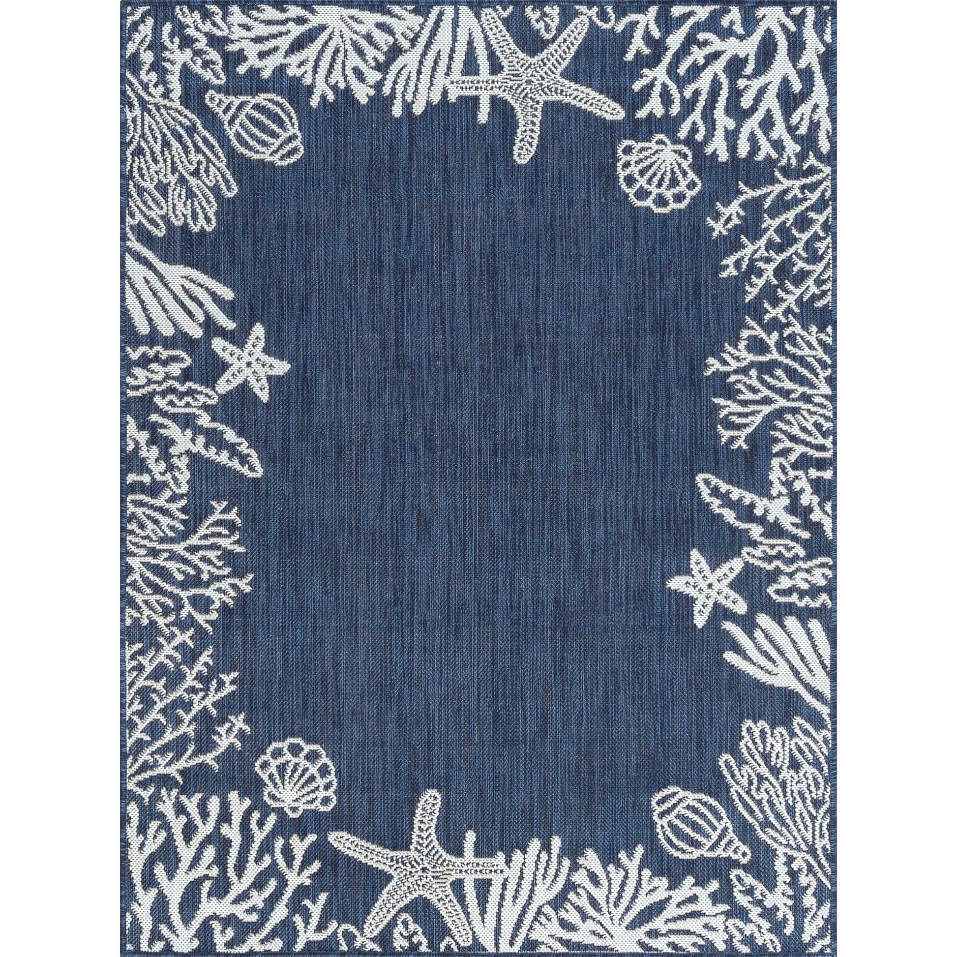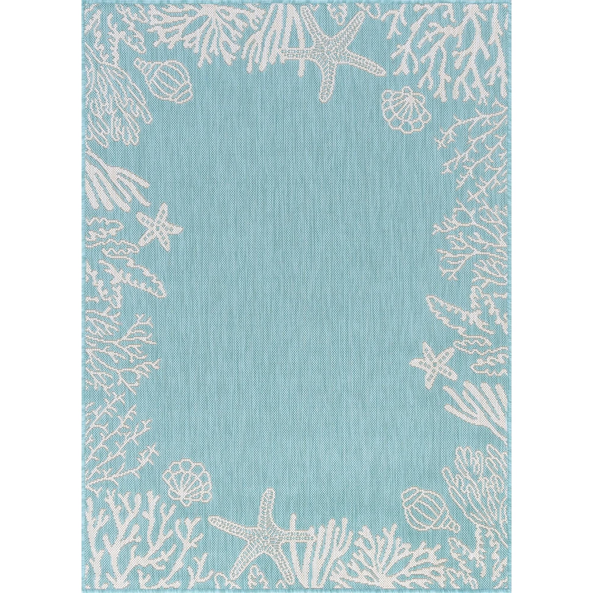 Bring the beauty of the sea to your indoor and outdoor spaces with this Exo Coastal Graphic Print Area Rug. Featuring a serene solid center and a stunning coral and shells graphic print, this rug is made with high-quality polypropylene fibers that resist staining and fading. Whether you place it in your family room, sunroom, porch, deck, den, living room, playroom, or nursery, this rug is built to perform and add a touch of trend style to any room.