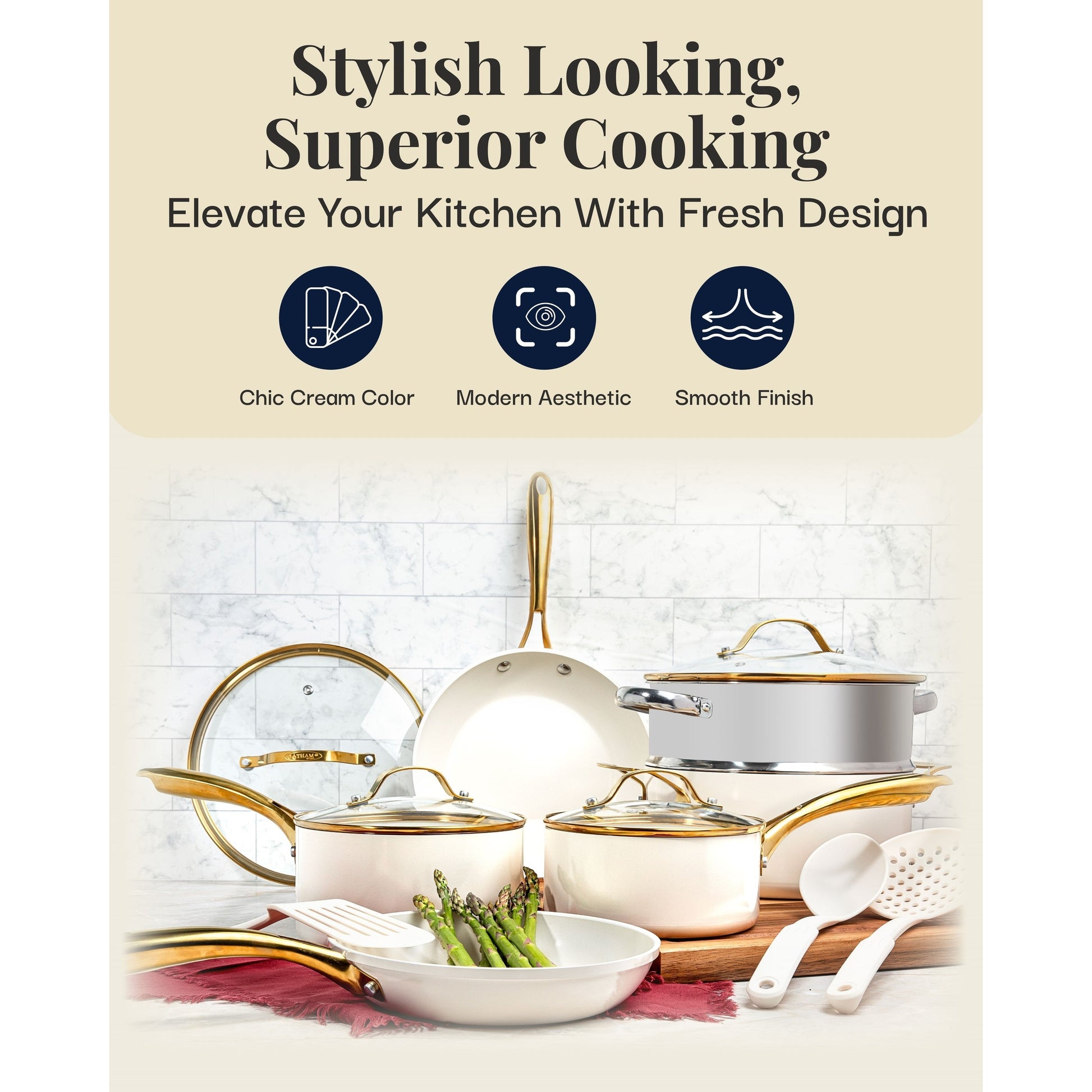 Batterie de cuisine antiadhésive en céramique Gotham Steel Cream, 15 pièces, avec ustensiles