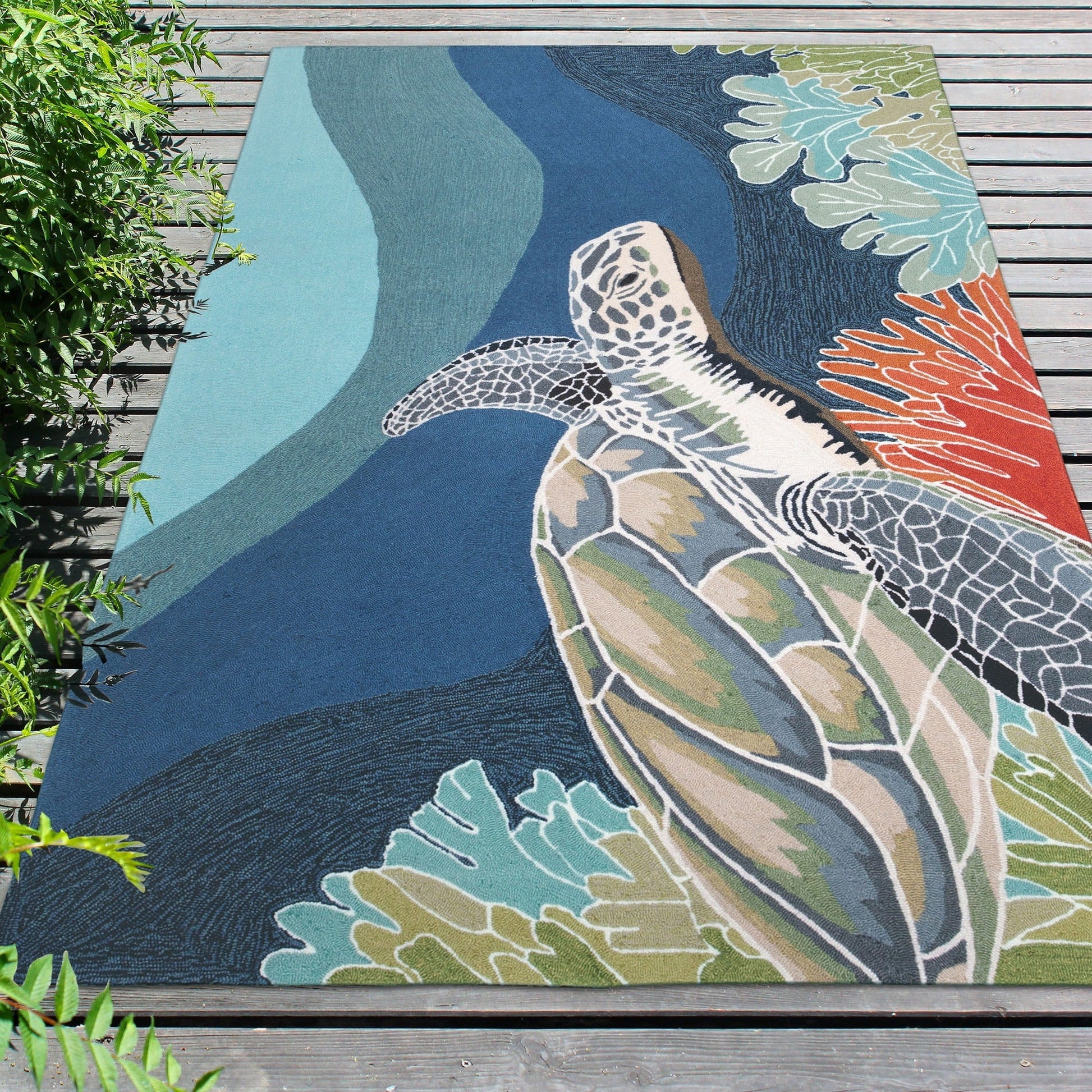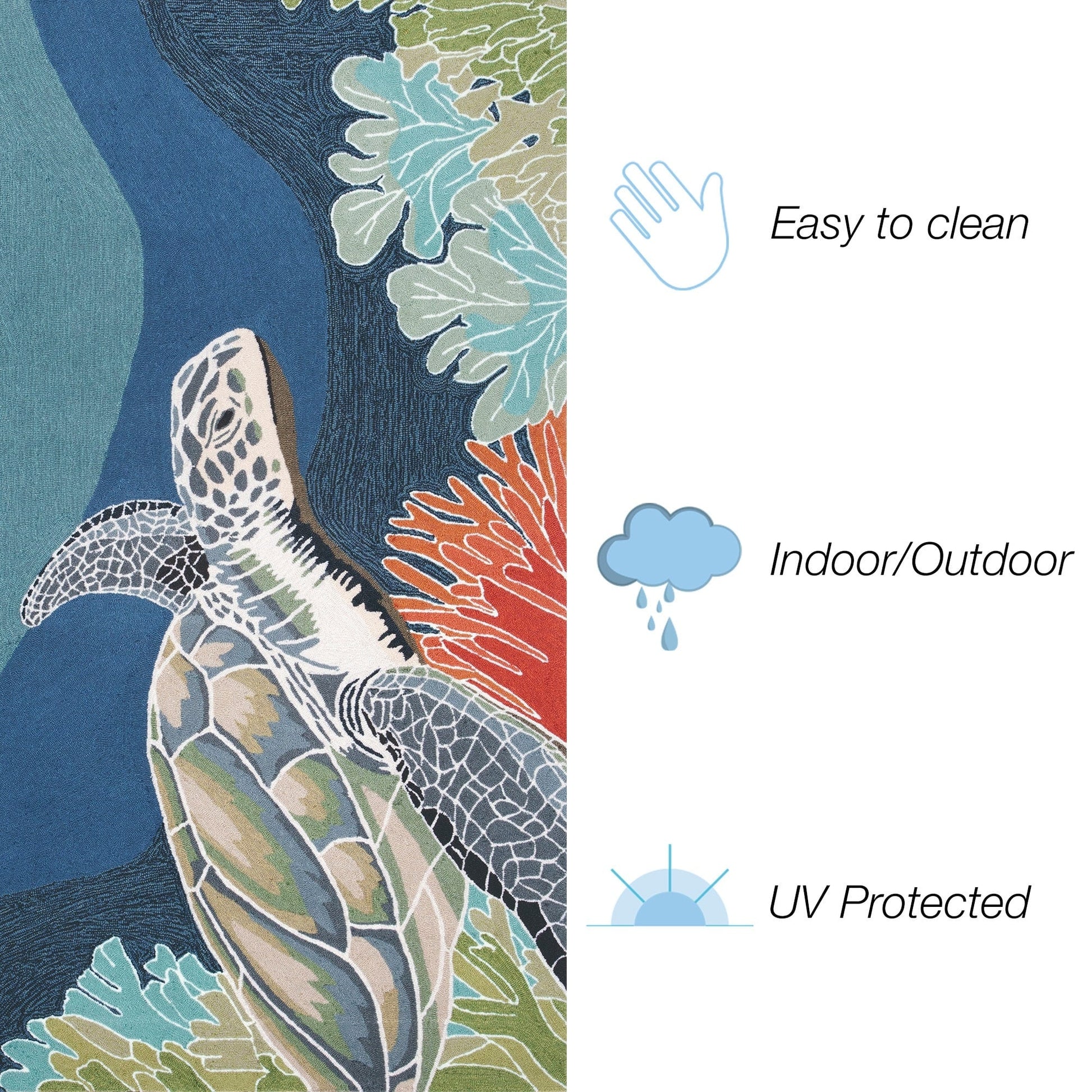 Bring the ocean to your doorstep with the Liora Manne Ravella Akumal Indoor/Outdoor Rug in Ocean. This hand-hooked area rug features a lifelike sea turtle swimming serenely underwater, adding a splash of color to any indoor or outdoor space. Made in China from a durable polyester acrylic blend, the Ravella Collection boasts a flatwoven, weather-resistant construction and a fade-resistant treatment, making it perfect for high traffic areas like your kitchen, living room, entryway or dining room. With intricately shaded yarns and tight textural loops, this soft and vibrant rug will beautifully accent your home.