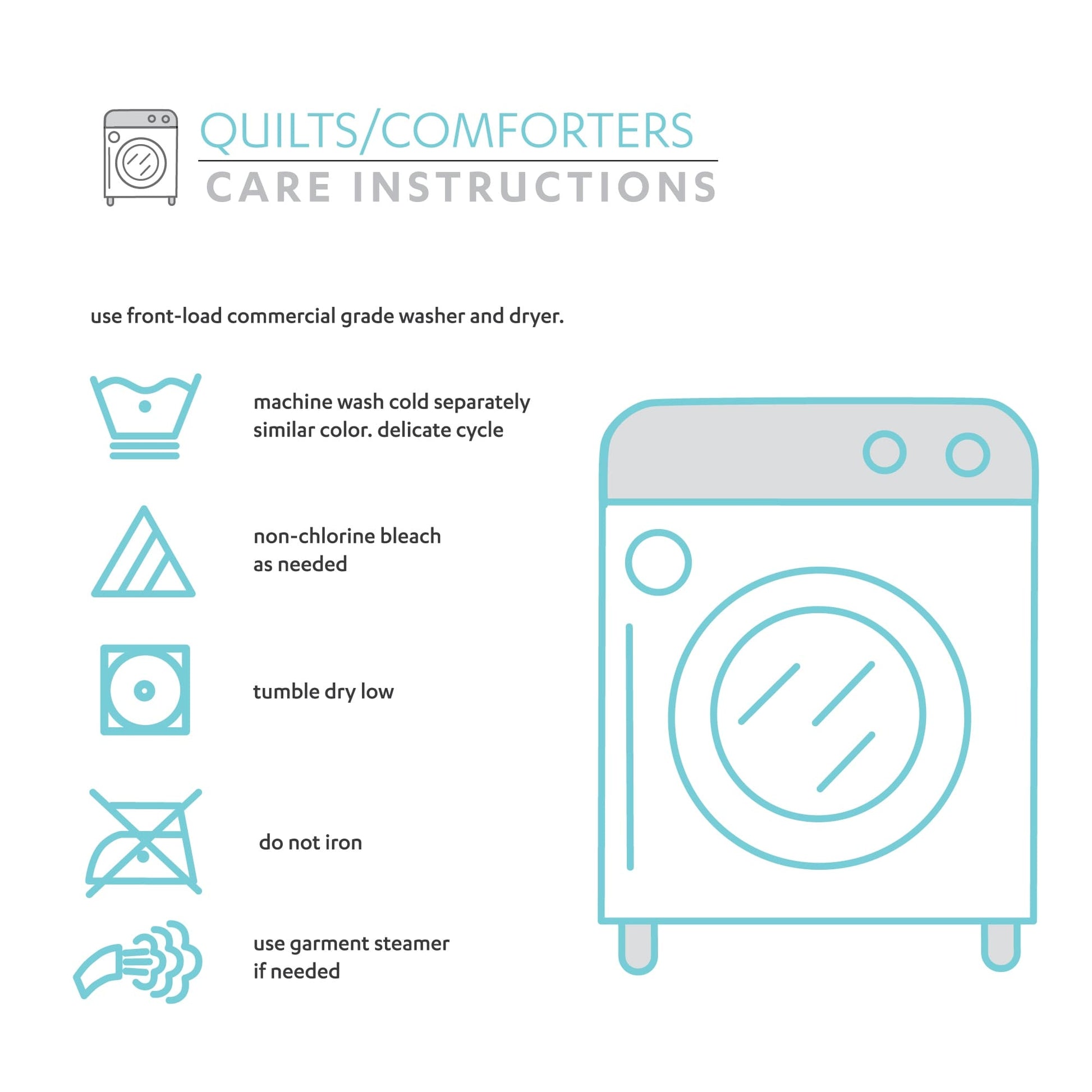 • Use Front-Load Commercial Grade Washer And Dryer. Machine Wash Cold Separately With Similar Colors. Delicate Cycle. Use Only Non-Chlorine Bleach If Needed.