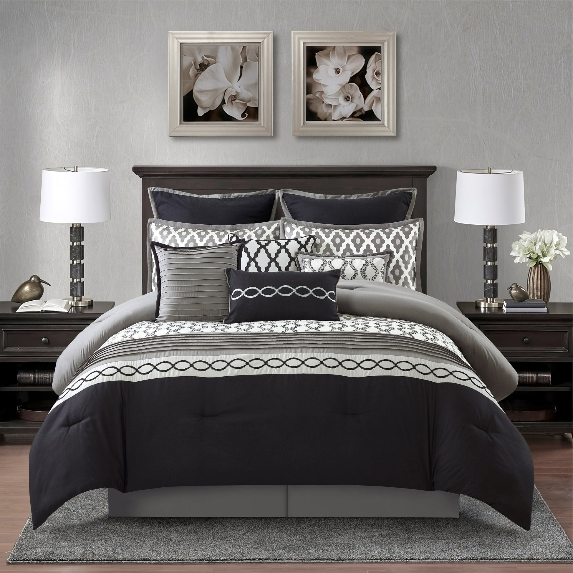 • 10-piece set including comforter, bedskirt, shams, euro shams, and decorative pillows