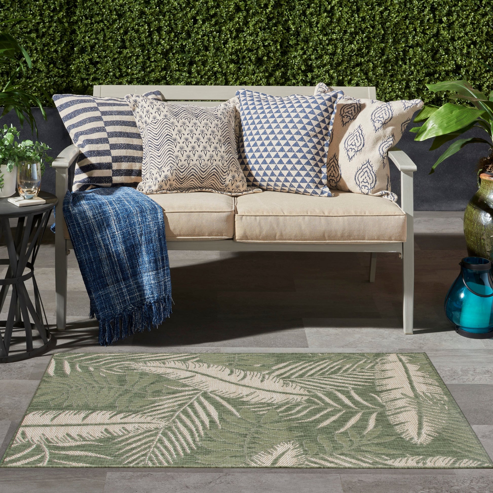 Enjoy vacation vibes from the comfort of your backyard with this ivory and green outdoor rug from the Garden Oasis Collection. The oversized tropical leaf pattern evokes feelings of lounging by the beach, with subtle tonal variations that add rhythmic appeal. Machine-made from polypropylene yarns for lasting style and all-weather performance, this flatweave rug is great for both indoor and outdoor spaces.
