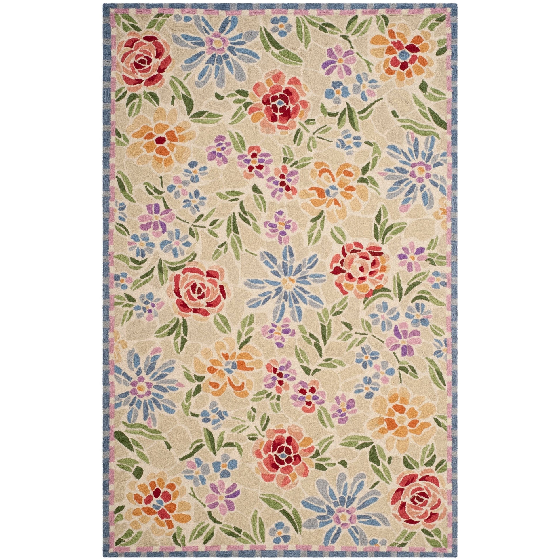 Introduce timeless charm and superior craftsmanship into your home with our exquisite hand-hooked wool area rug, elegantly sized at 1'-8' by 2'-6'. Expertly fashioned in China, this accent rug boasts a plush 3/8' pile height that provides both comfort and sophistication underfoot.Crafted with meticulous attention to detail, each rug is constructed from the finest wool pile, ensuring a luxurious and durable surface that is both warm and inviting. The ivory background serves as the perfect canvas for the vibrant floral pattern that adorns the rug, brimming with an array of roses and wildflowers in a rich palette of blues, purples, oranges, and yellows. This joyous burst of color is harmoniously bordered by an elegant stripe motif, adding a playful yet refined edge to the design.The hand-hooked technique used to create this rug resonates with tradition and skill, guaranteeing that each piece is as unique as it is beautiful. Ideal for adding a touch of elegance to small spaces, entryways, or as a luxurious accent piece, this rug's timeless style and artisanal quality make it a must-have for those who appreciate the finer things in life. Embrace the allure of this woolen masterpiece and let it be the cornerstone of your decor for years to come.